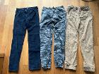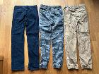 写真のズボン(コーデュロイ紺色、カモフラージュ灰色系2枚重ね生地、ベージュ系チノ)をまとめて6ユーロでお譲りします。状態はいいです(特に紺色とベージュはほぼ未使用)。