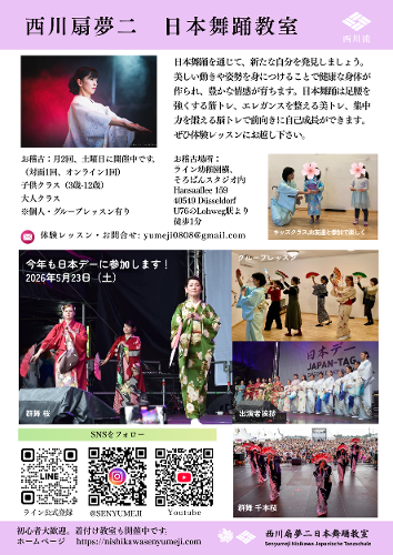 日本舞踊を学びませんか?現在西川扇夢二日本舞踊教室では、フランクフルトとデュッセルドルフで受講生を募集しています。体験レッスンご希望の方は、ぜひお問合せ下さい。