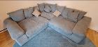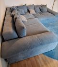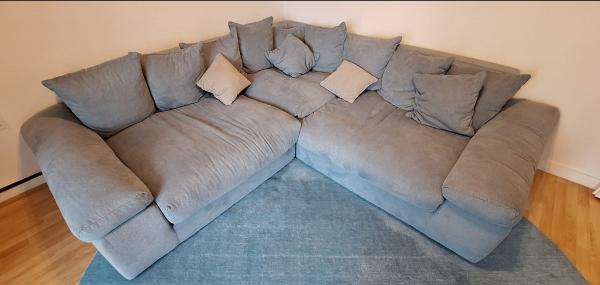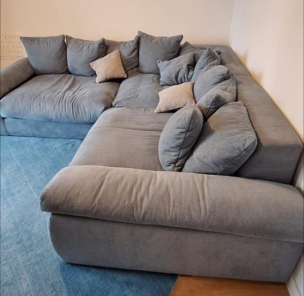 ブルーグレーの大型L字ソファ+オットマン付きのセットです。