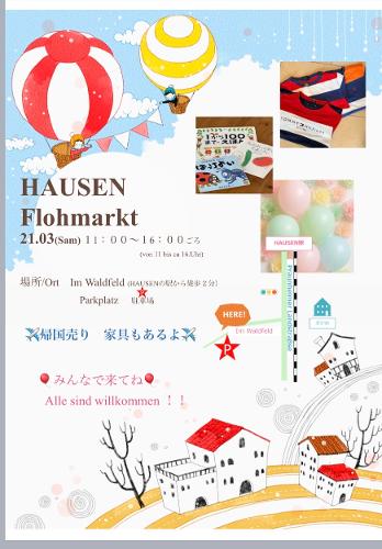 日時:3月21日土曜日11時〜16時場所:Im Waldfeld 駐車場 (Hausen駅から徒歩2分)6家族合同で食器、本、日用品、子供用品、洋服、家具などを販売します。お散歩がてらにぜひお寄りください♪