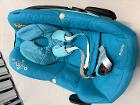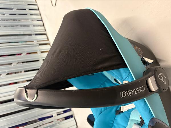 ハンドルを動かしてベビーキャリアとして使用可能。チャイルドシートとして使用可能な車に設置する台座とセットでお譲りします。